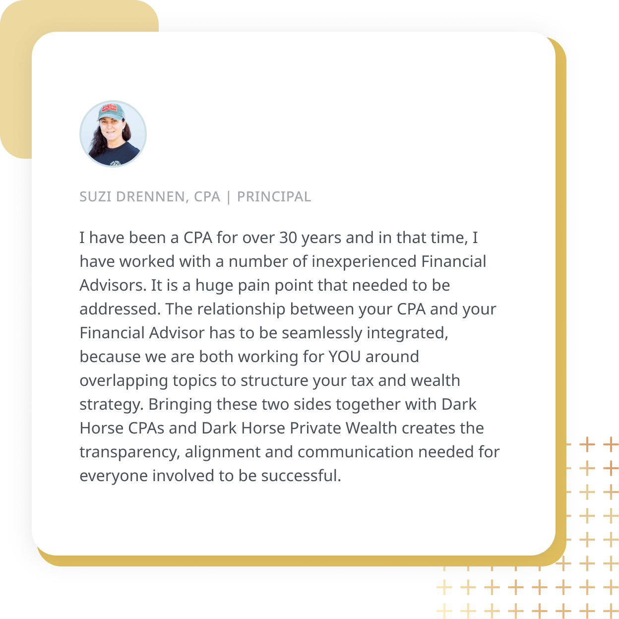 Dark Horse can handle it all—from your personal finances and taxes to the forecasting, analysis, and strategy you need for your business. And because we're CPAs, we're not just managing your wealth. We're deploying strategies that help you keep more of what we grow together.