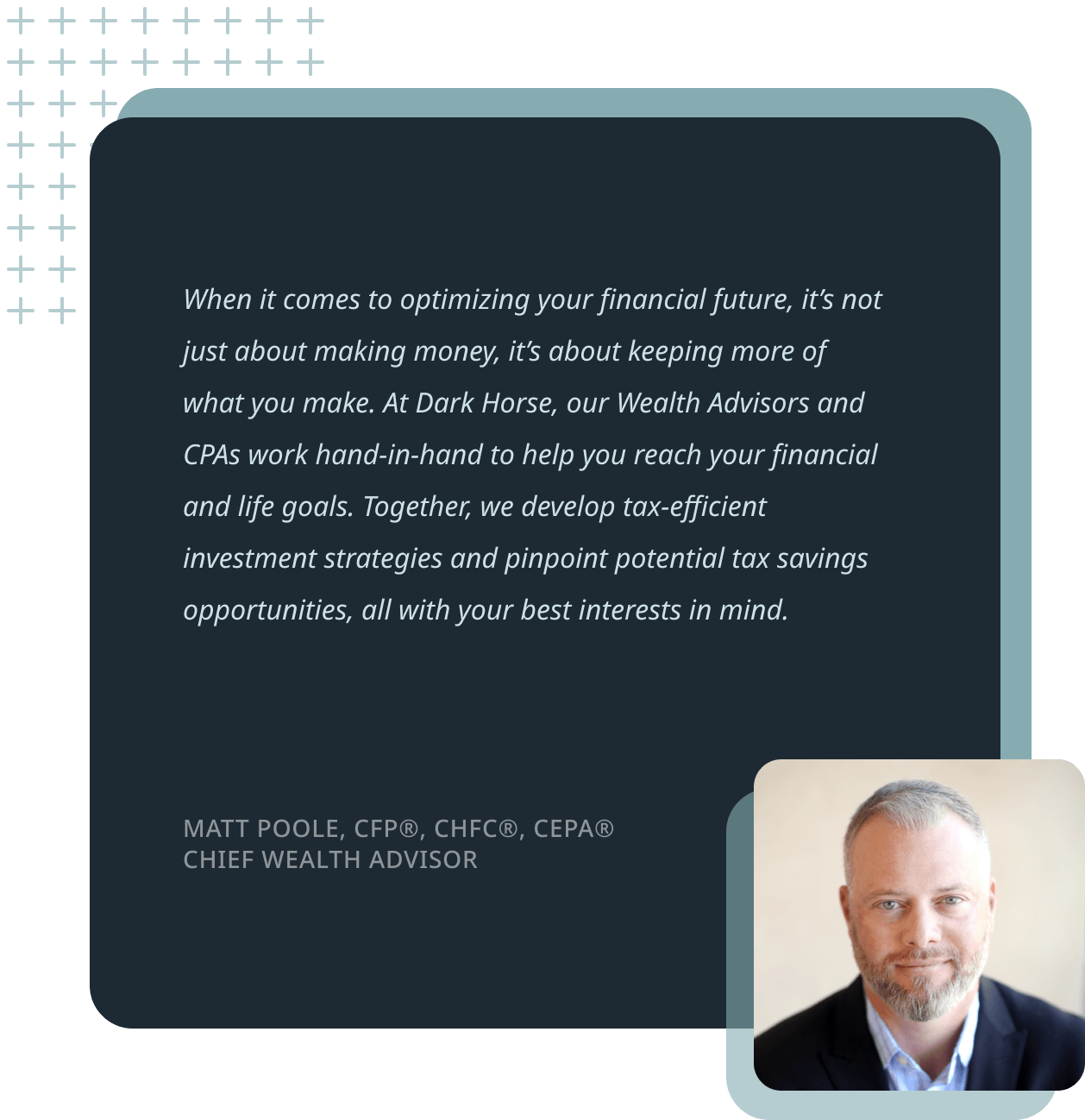 Taxes reduce your return on investment. While you can't totally eliminate the taxes related to your investments, you can substantially reduce or defer them with proper tax planning. That's what Dark Horse Private Wealth is all about...minimizing the taxes that eat away at your investments. We build financial plans and investment strategies for our clients that equally weigh tax efficiency and overall investment performance.